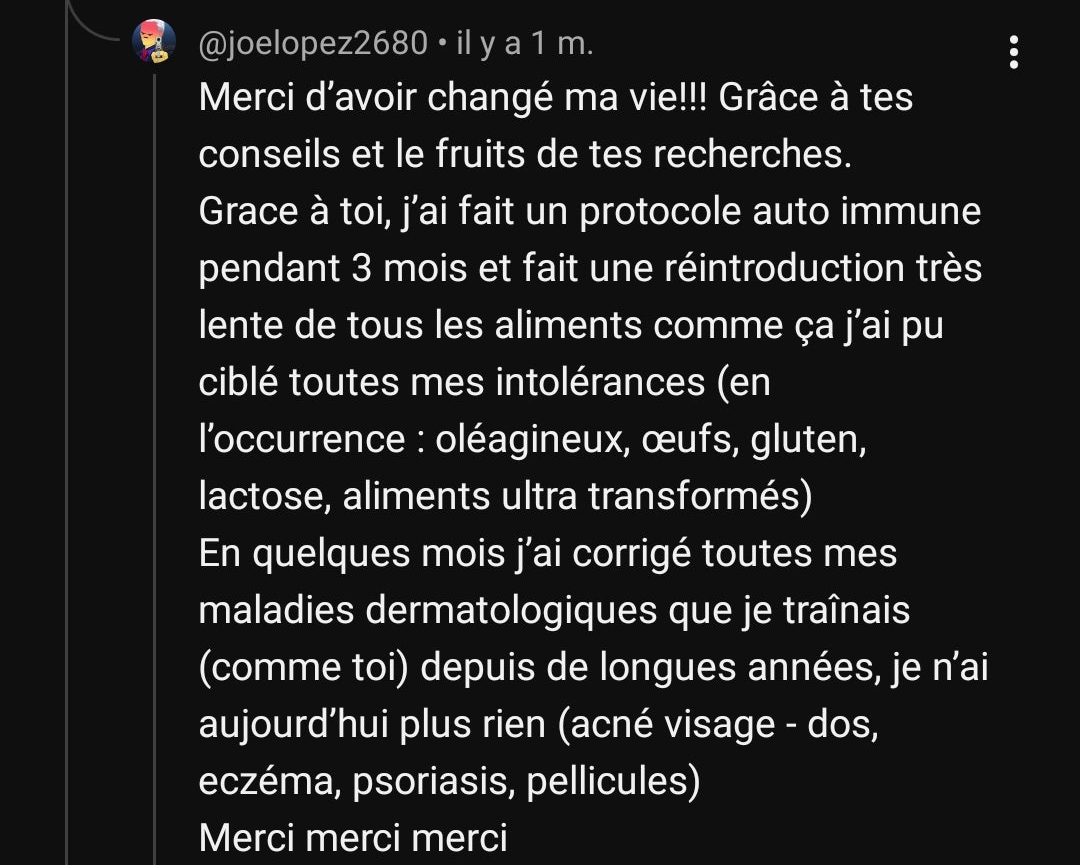 En quelques mois j’ai corrigé toutes mes maladies dermatologiques que je traînais (comme toi) depuis de longues années, je n’ai aujourd’hui plus rien (acné visage - dos, eczéma, psoriasis, pellicules)
