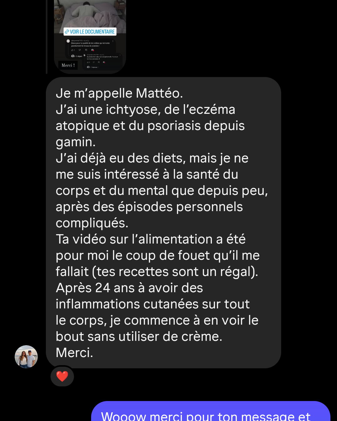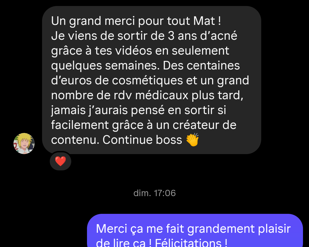 "Un grand merci pour tout Mat ! Je viens de sortir de 3 ans d’acné grâce à tes vidéos en seulement quelques semaines. Des centaines d’euros de cosmétiques et un grand nombre de rdv médicaux plus tard, jamais j’aurais pensé en sortir si facilement grâce à un créateur de contenu. Continue boss"