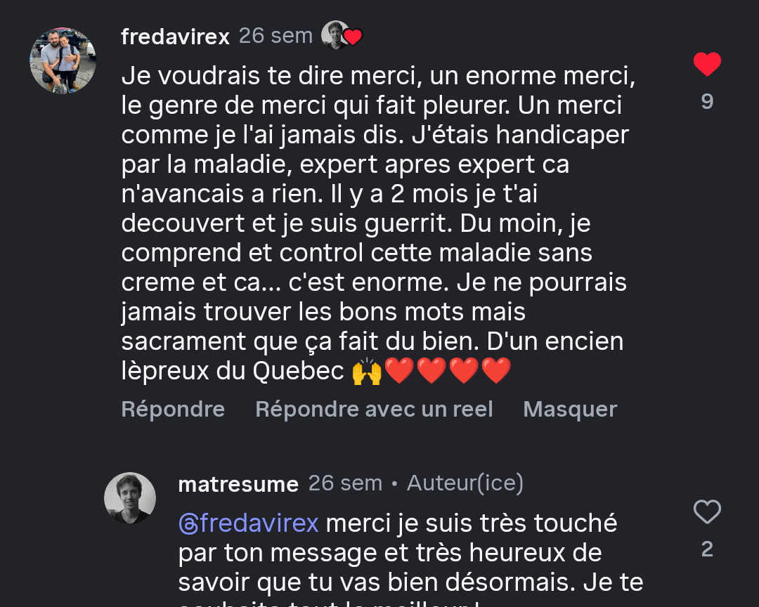"Je voudrais te dire merci, un énorme merci, le genre de merci qui fait pleurer. Un merci comme je l'ai jamais dit. J'étais handicapé par la maladie, expert après expert ça n'avançait à rien. Il y a 2 mois je t'ai découvert et je suis guéri. Du moins je comprends et contrôle cette maladie sans crème et ça... C'est énorme. Je ne pourrai jamais trouver les bons mots mais sacrament que ça fait du bien."