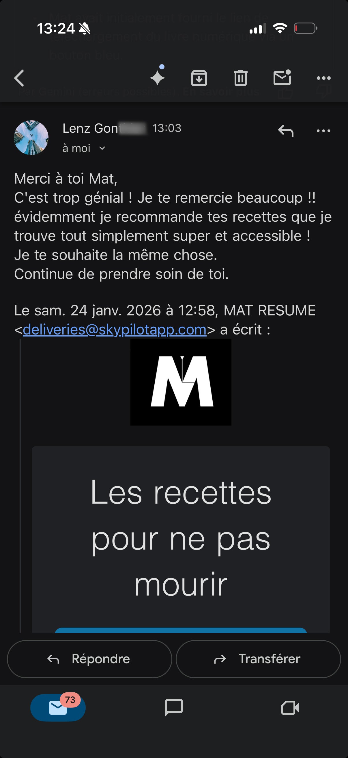 "Bravo Mat ! Documentaire passionnant et qui a résonné en moi de façon incroyable. J’ai acheté ton livre de recettes et je suis sincèrement impressionné ! Ton porridge est à tomber par terre et tes pancakes sont délicieux! "