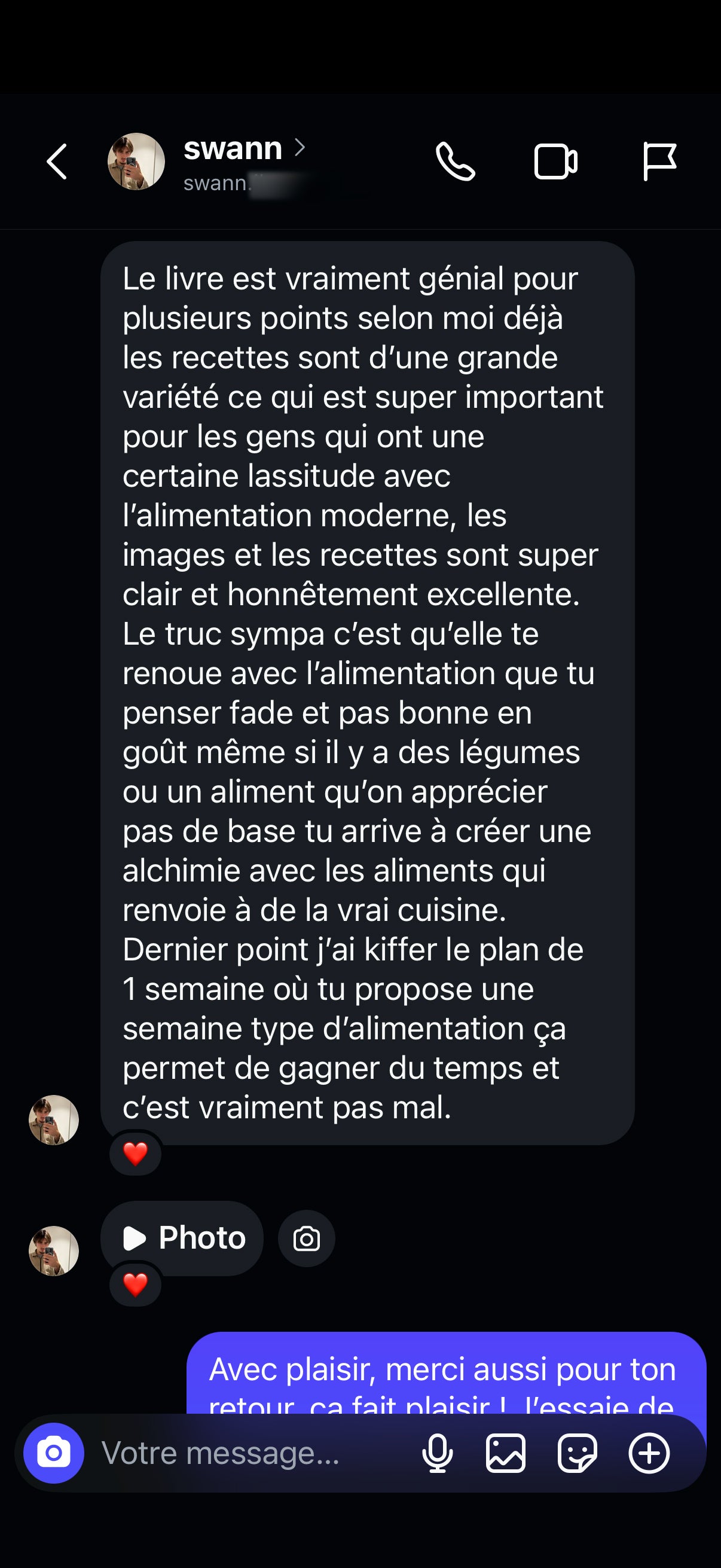 "Le livre est vraiment génial pour plusieurs points selon moi. Déjà les recettes sont d'une grande variété ce qui est super important pour les gens qui ont une lassitude avec l'alimentation moderne, les images et les recettes sont super claires et honnêtement excellentes."